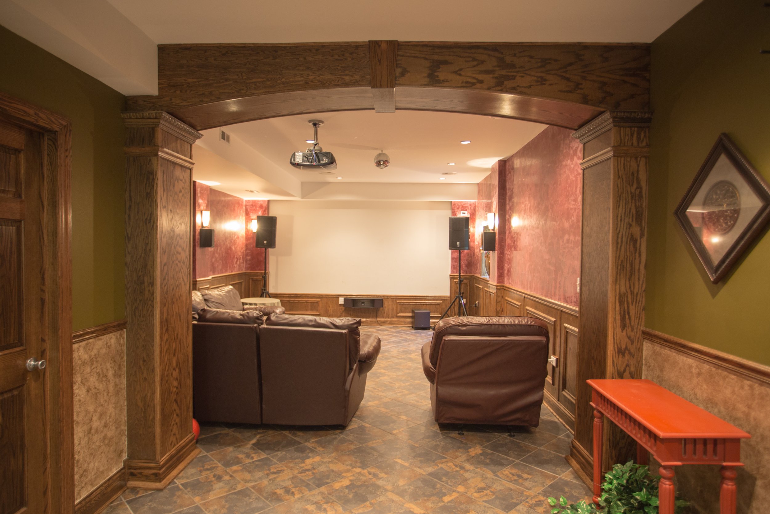 The renovation unfolds with a custom soccer trophy showcase at the base of the staircase, honoring years of achievement before opening into a spacious great-room layout defined by faux finishes and tailored chair rail detailing ideal for large family gatherings. Oversized architectural columns frame a dramatic arched entry into a fully appointed wet bar, featuring a custom bar back, commercial-grade beverage refrigeration, a canopy feature, and an integrated surround-sound hub designed for seamless performance and elevated entertaining. At the rear of the home, the space transitions into a private theater framed by grand columns and an arched entry, complete with custom wainscoting, classic wall sconces, immersive theater sound, ceiling-mounted projection, and Venetian plaster walls that add warmth and refinement, resulting in a finished basement designed, planned, and built for a family that truly lives life together.