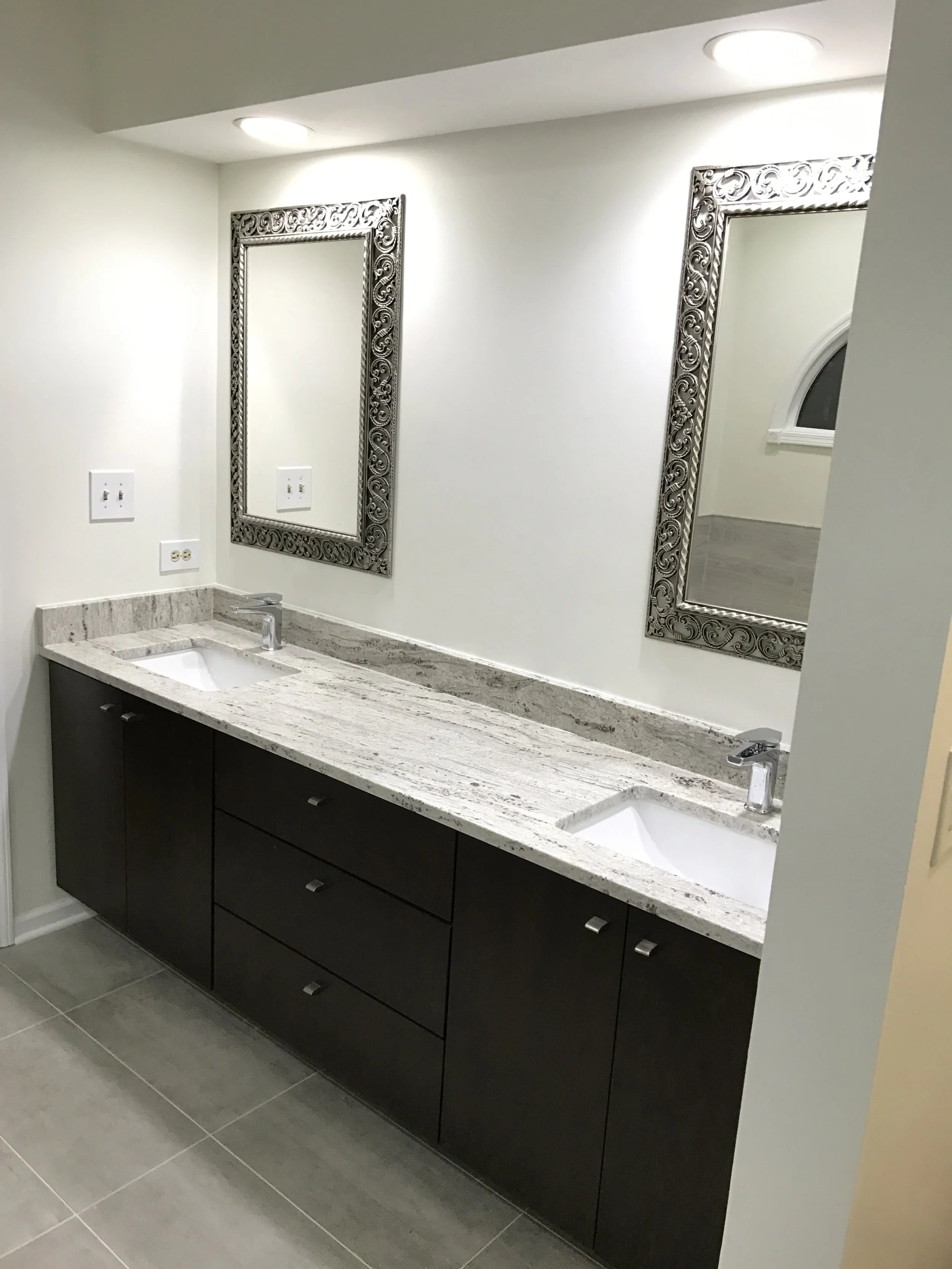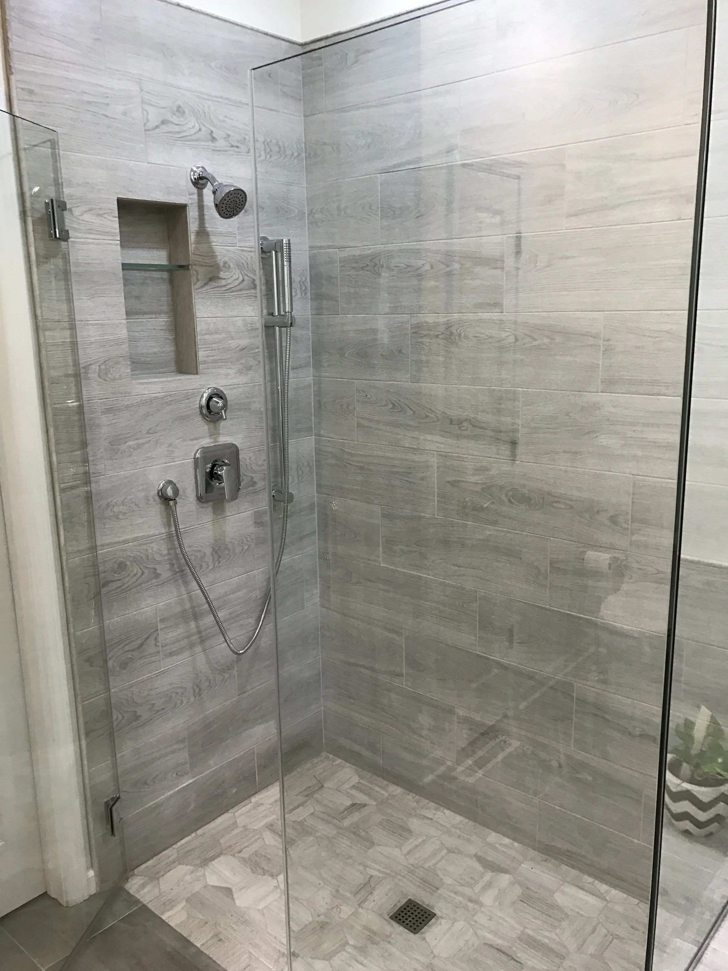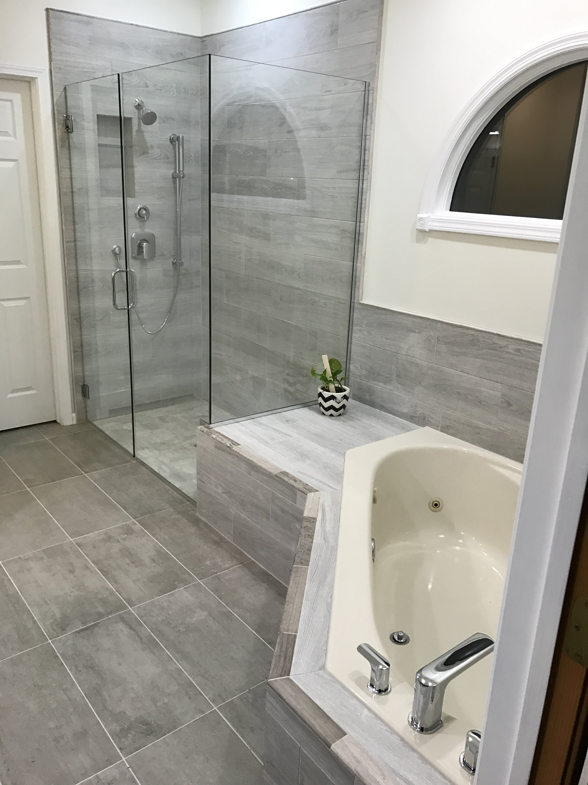 The master bath was reworked to incorporate a spacious, no-threshold walk-in shower with a seamless curbless base and full glass enclosure. The tiled niche was strategically placed within the only available interior wall cavity. A floating custom vanity introduces a sharp, modern profile, paired with granite countertop and streamlined fixtures. Large-format floor tile outside the shower and rustic wood grain tile wall surround, tying the space together with a cohesive, contemporary rustic finish.