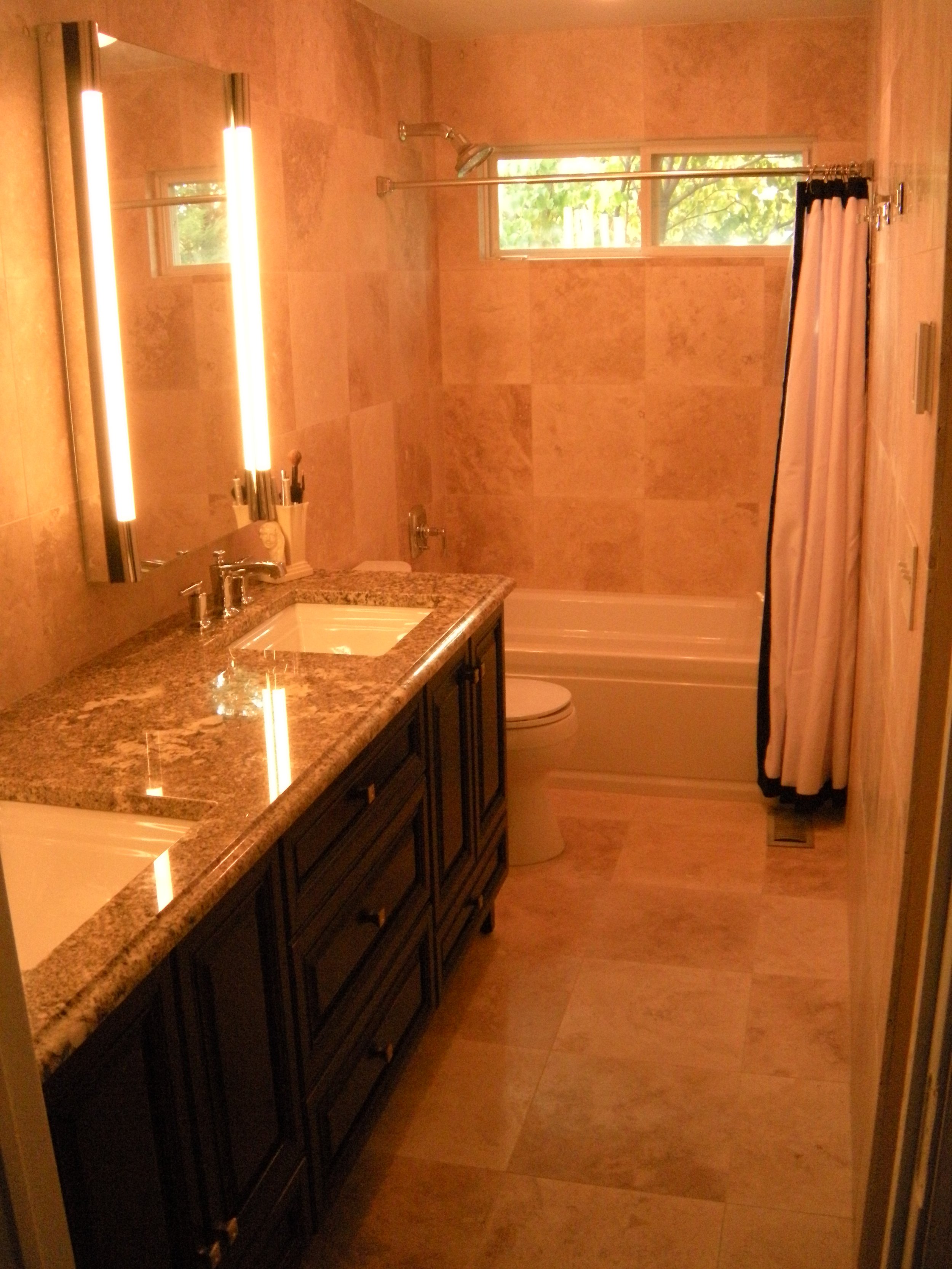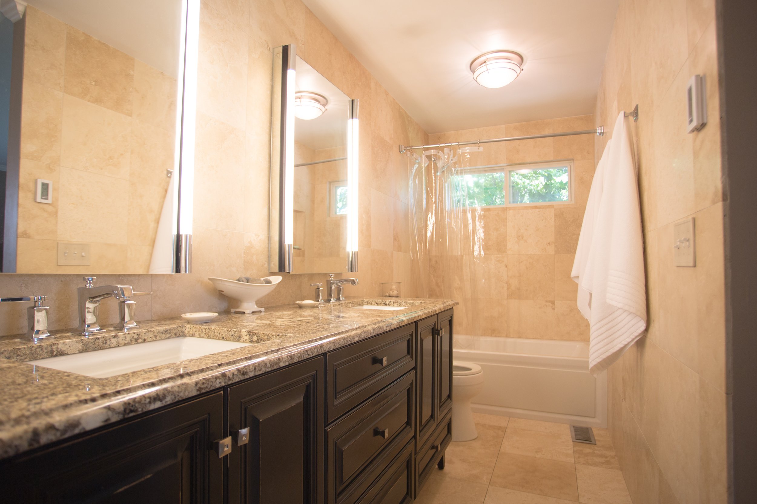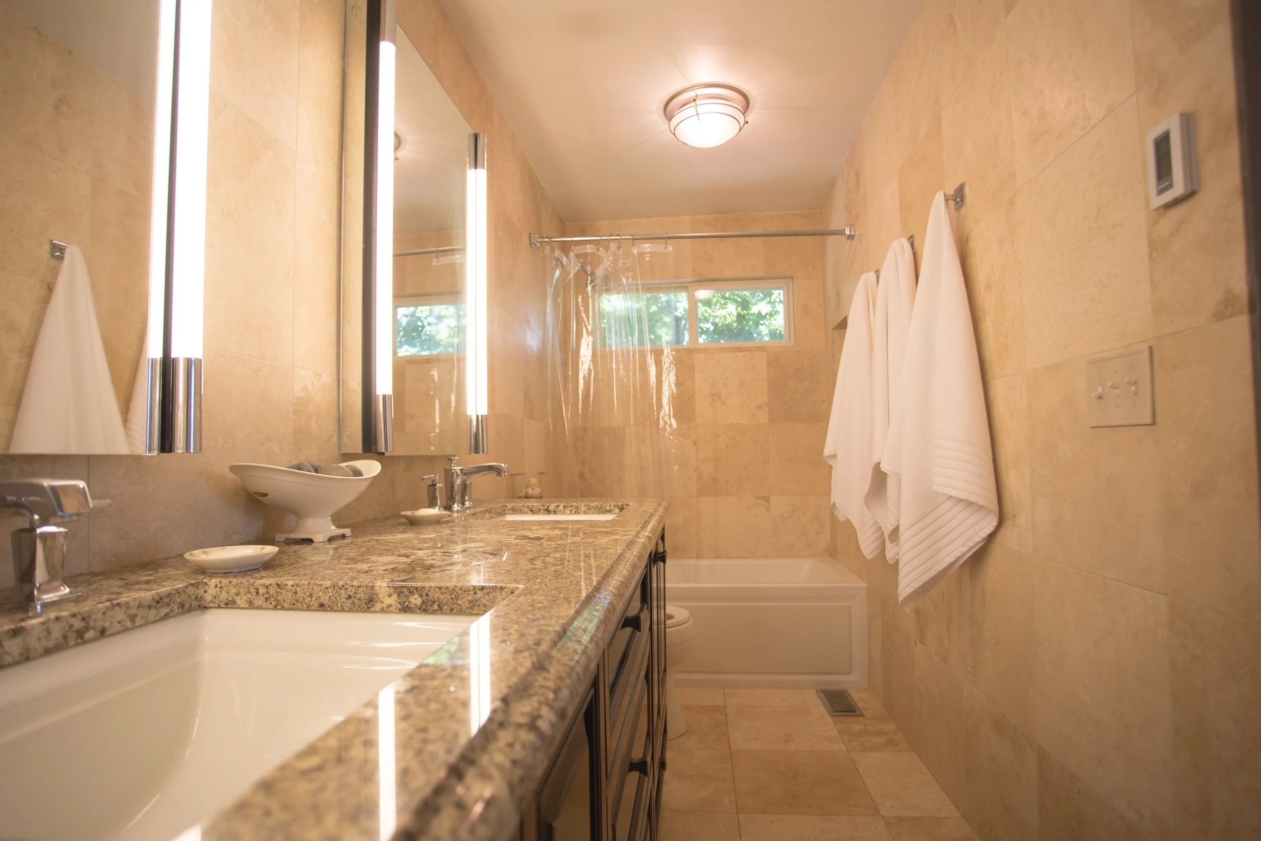 The space was reimagined as a calm, enduring retreat with floor-to-ceiling travertine walls that wrap the room in natural warmth and understated luxury. A custom vanity anchors the design, topped with a polished granite countertop that balances elegance with durability, while his-and-hers built-in medicine cabinets provide generous concealed storage and integrated appliance power to support modern daily rituals without visual clutter. Soft, layered lighting enhances the tranquil atmosphere, and anti-fog mirrors ensure effortless usability, resulting in a spa-caliber bathroom designed and built for everyday elegance.