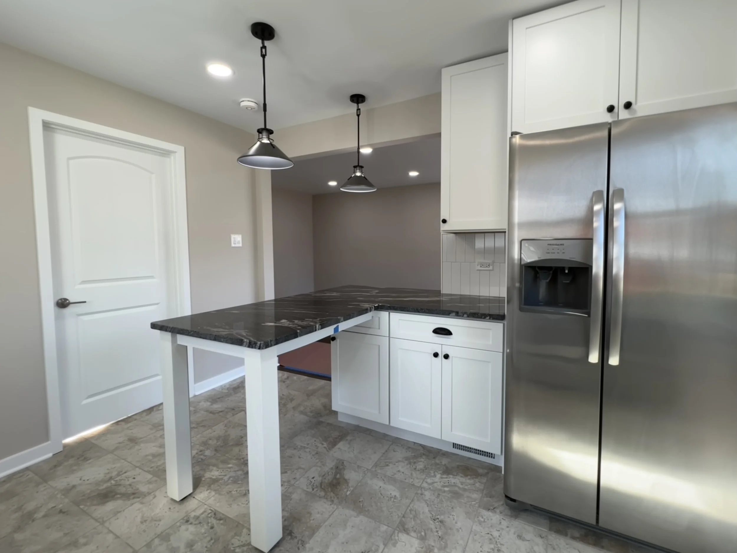 The kitchen was partially opened to the family room, creating better flow and visibility while adding much-needed cabinet space. A custom-built peninsula was incorporated to serve as both a prep area and casual dining spot — perfectly scaled to enhance the layout without crowding it. The space features full-height cabinetry, black granite countertops, and a ceramic tile backsplash, all accented by recessed LED lighting and a pair of pendant lights above the peninsula.