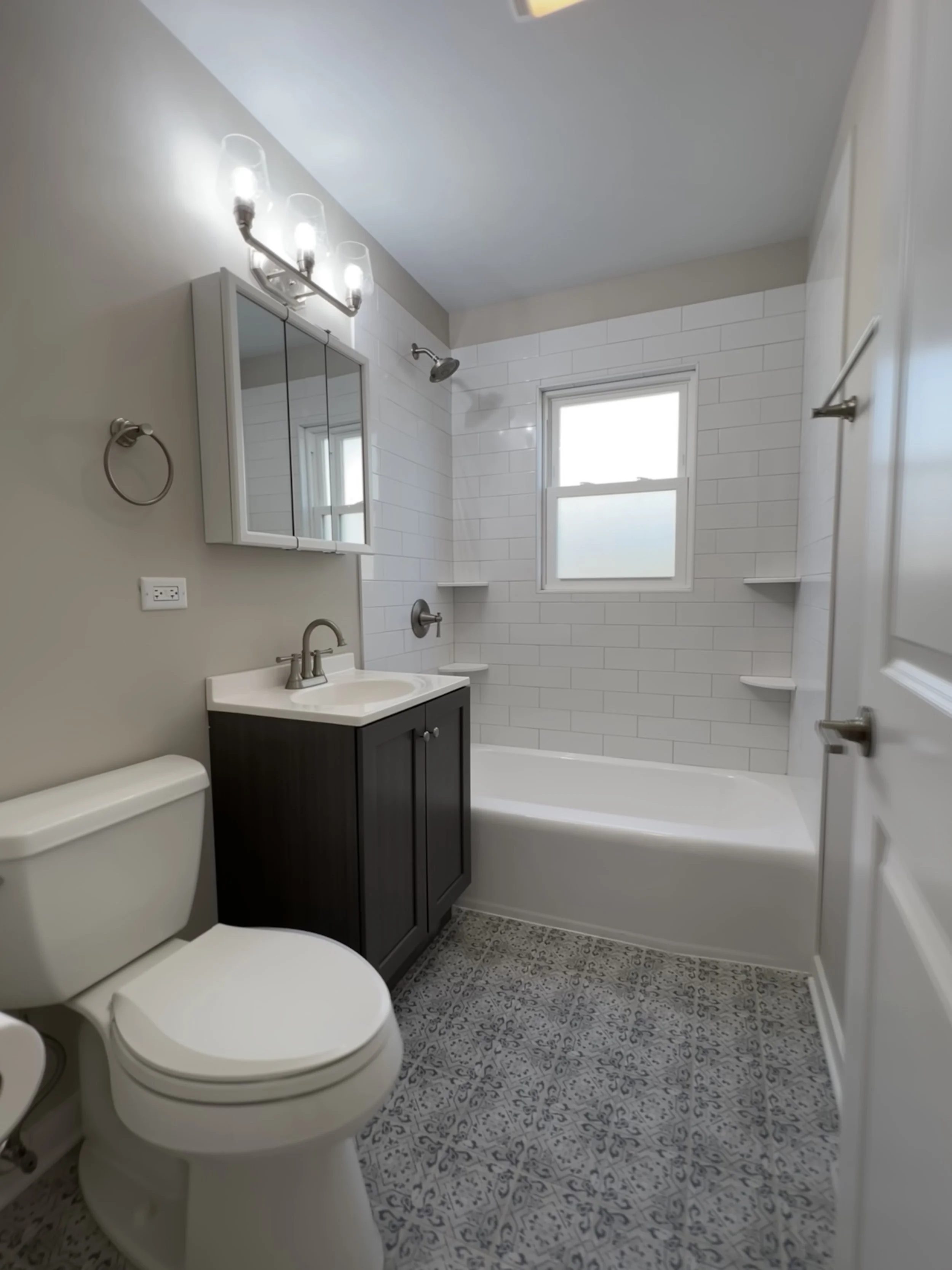 The bathroom received classic upgrades, including a subway-tile shower with built-in corner shelves, brushed nickel traditional-style fixtures, and a textile-pattern floor tile that adds personality and warmth.