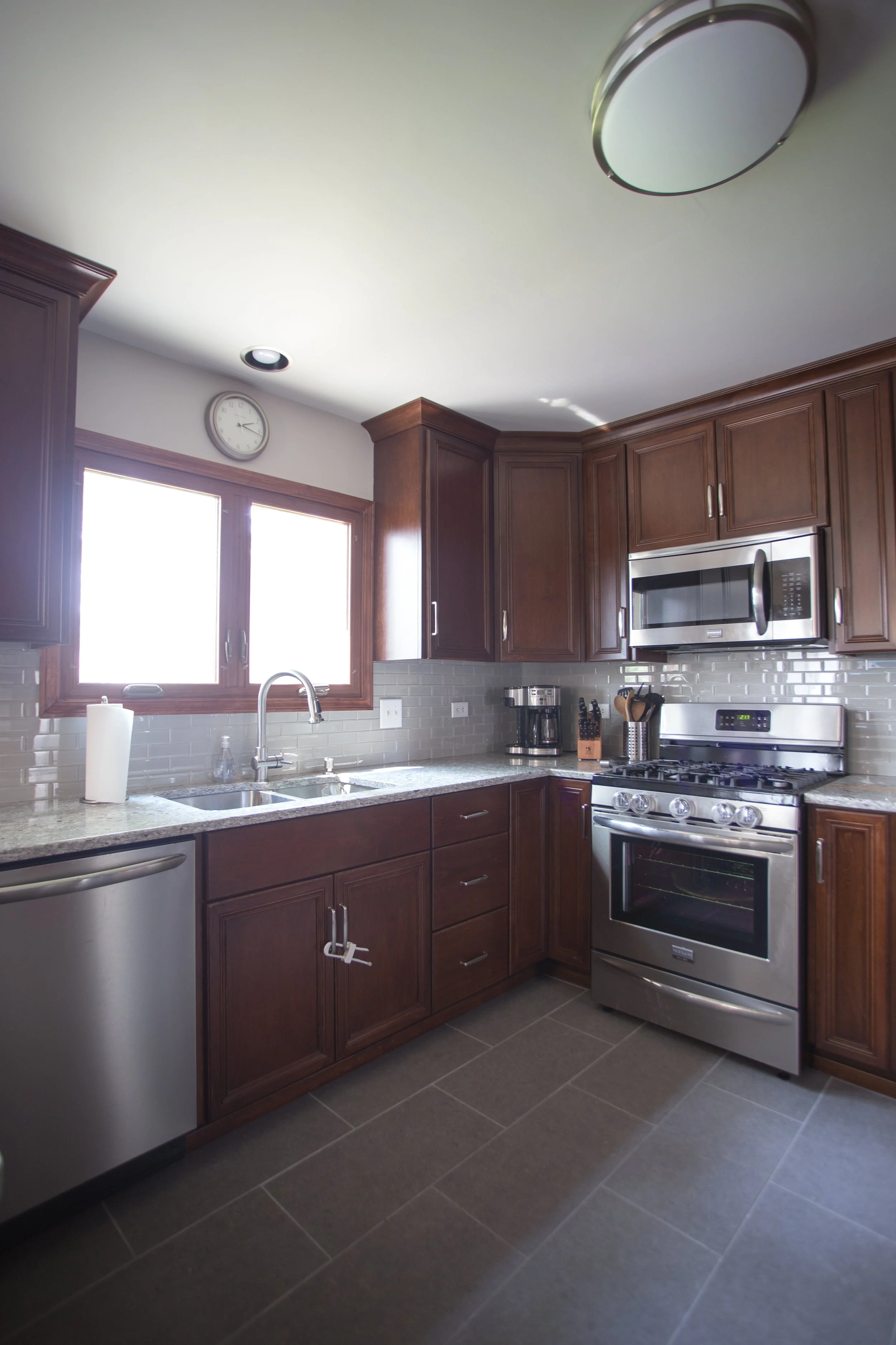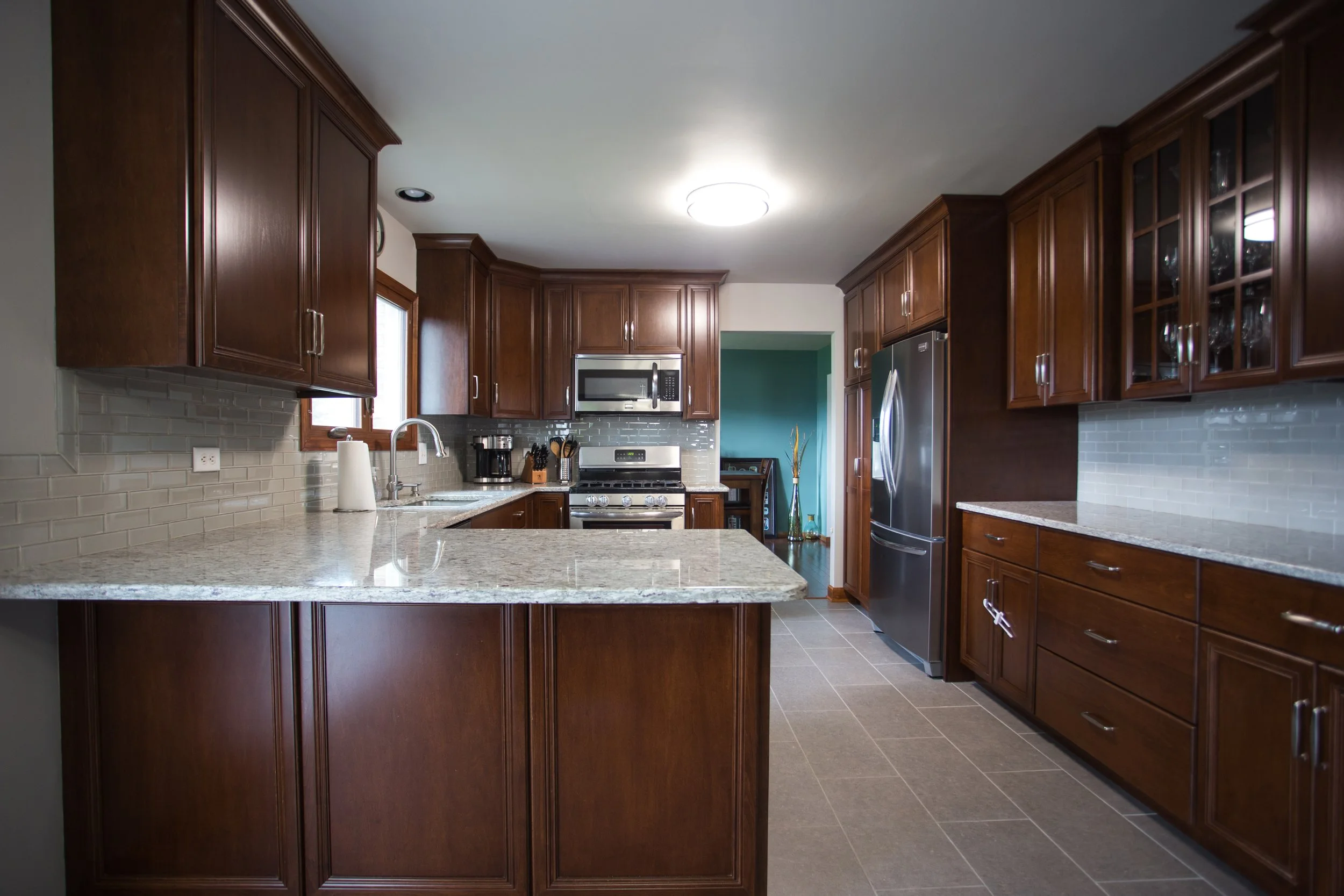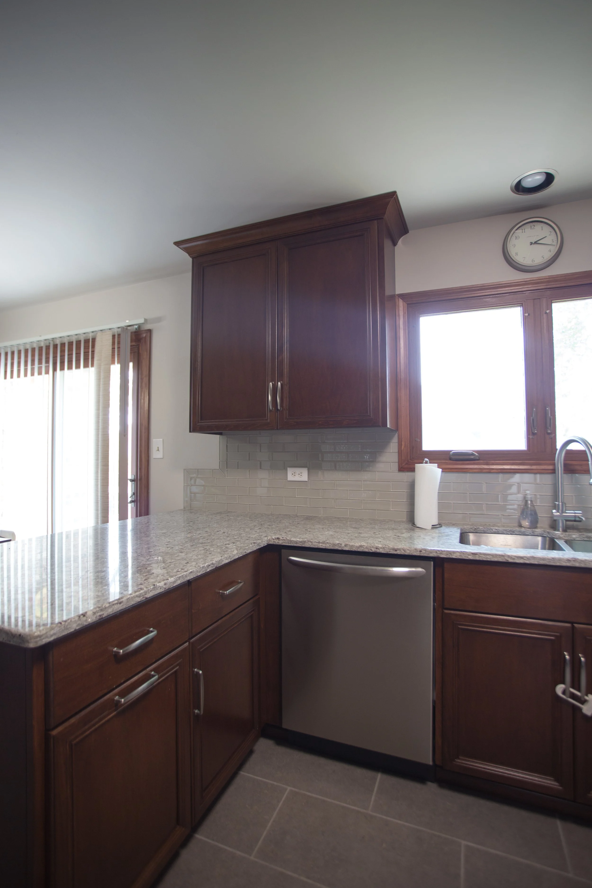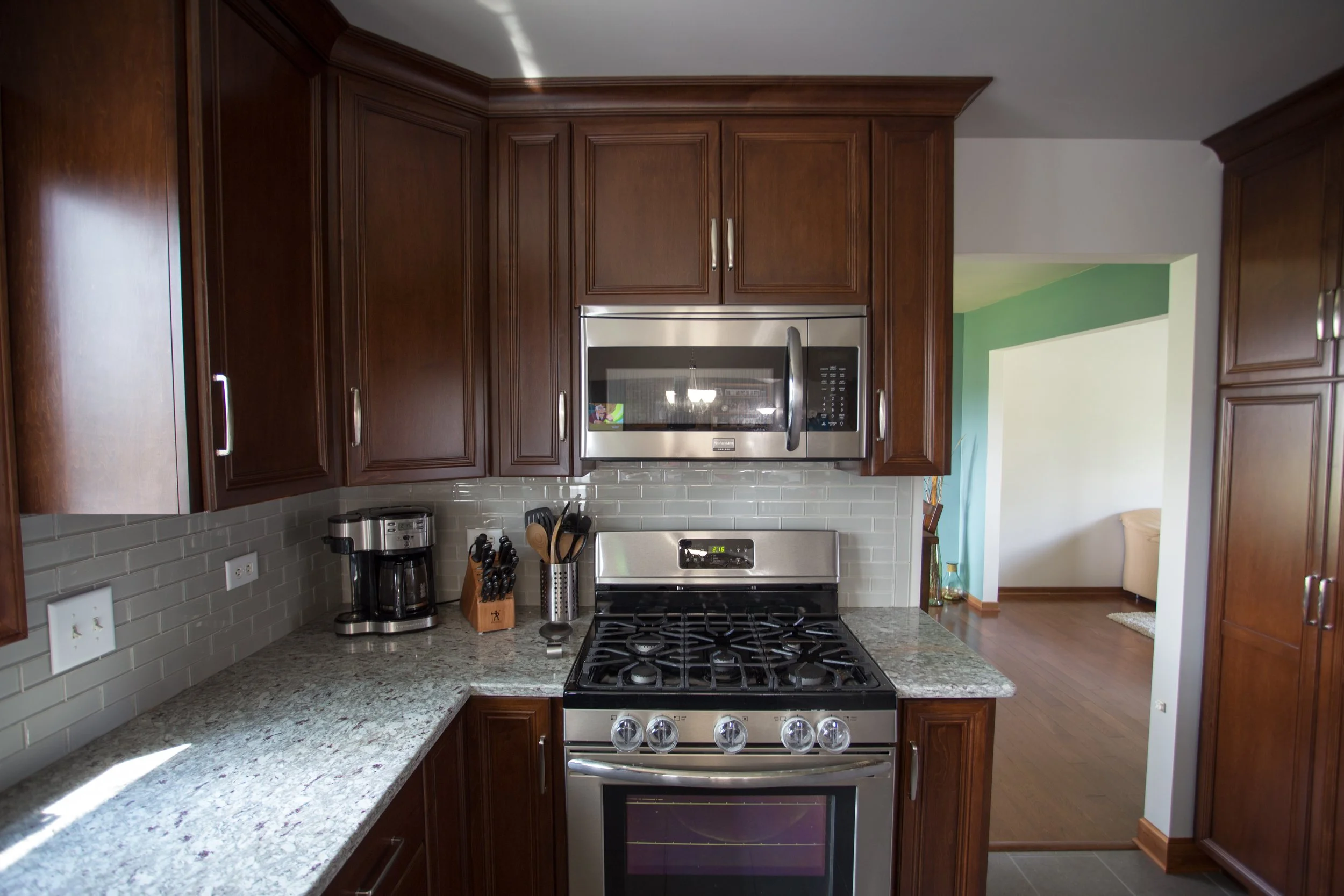 Warm cabinetry now frames the room with consistency, paired with natural stone countertops and a crisp tile backsplash that brightens the workspace. Updated appliances integrate seamlessly, while sleek under cabinet lighting and hardware bring a refined, modern edge.